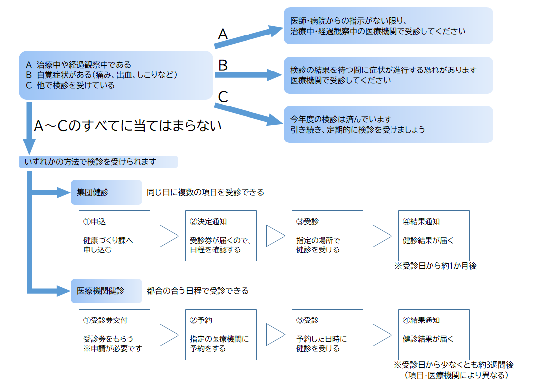 - 健康づくり課の窓口で発行する受診券を使い、医療機関で受診する医療機関健診