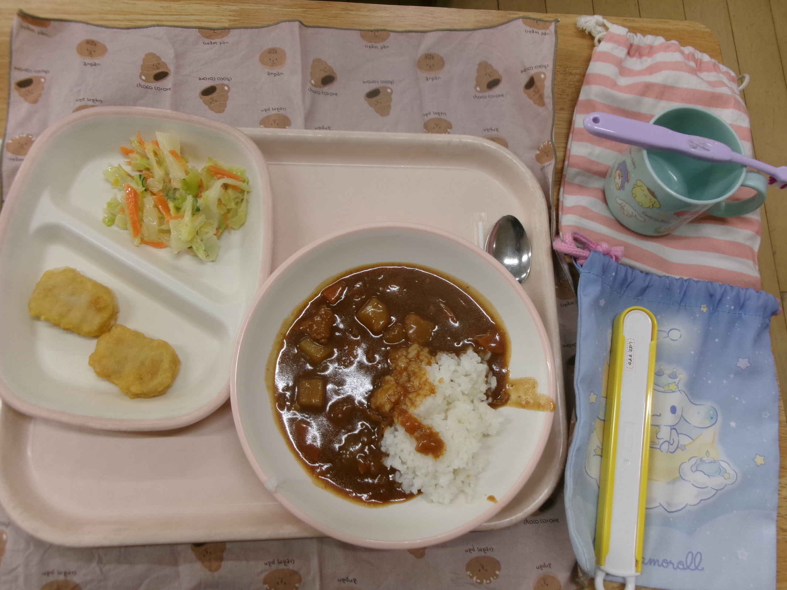 ごはん、牛乳、ハヤシライス、チキンナゲット(2こ)、コールスローサラダ、