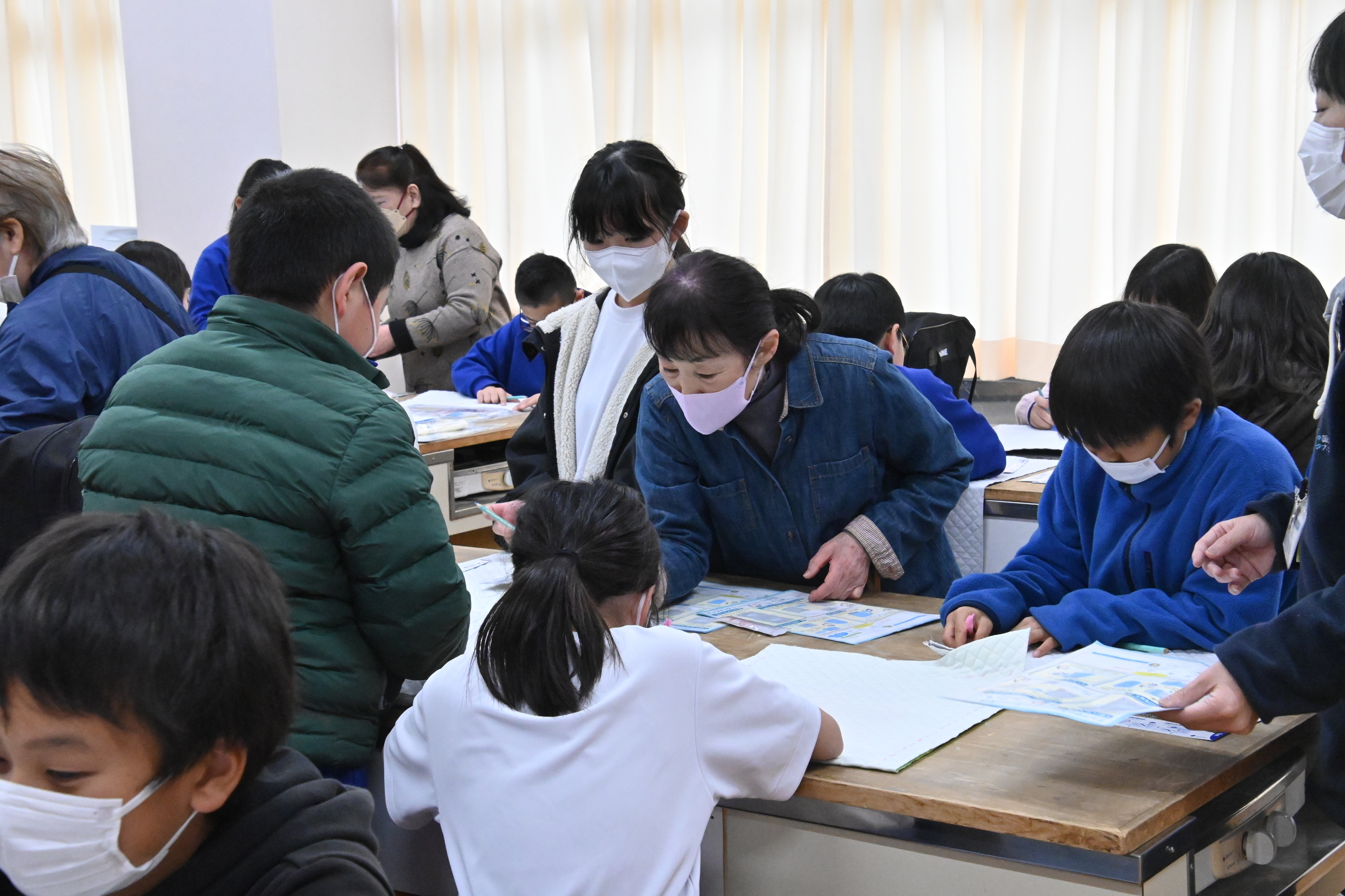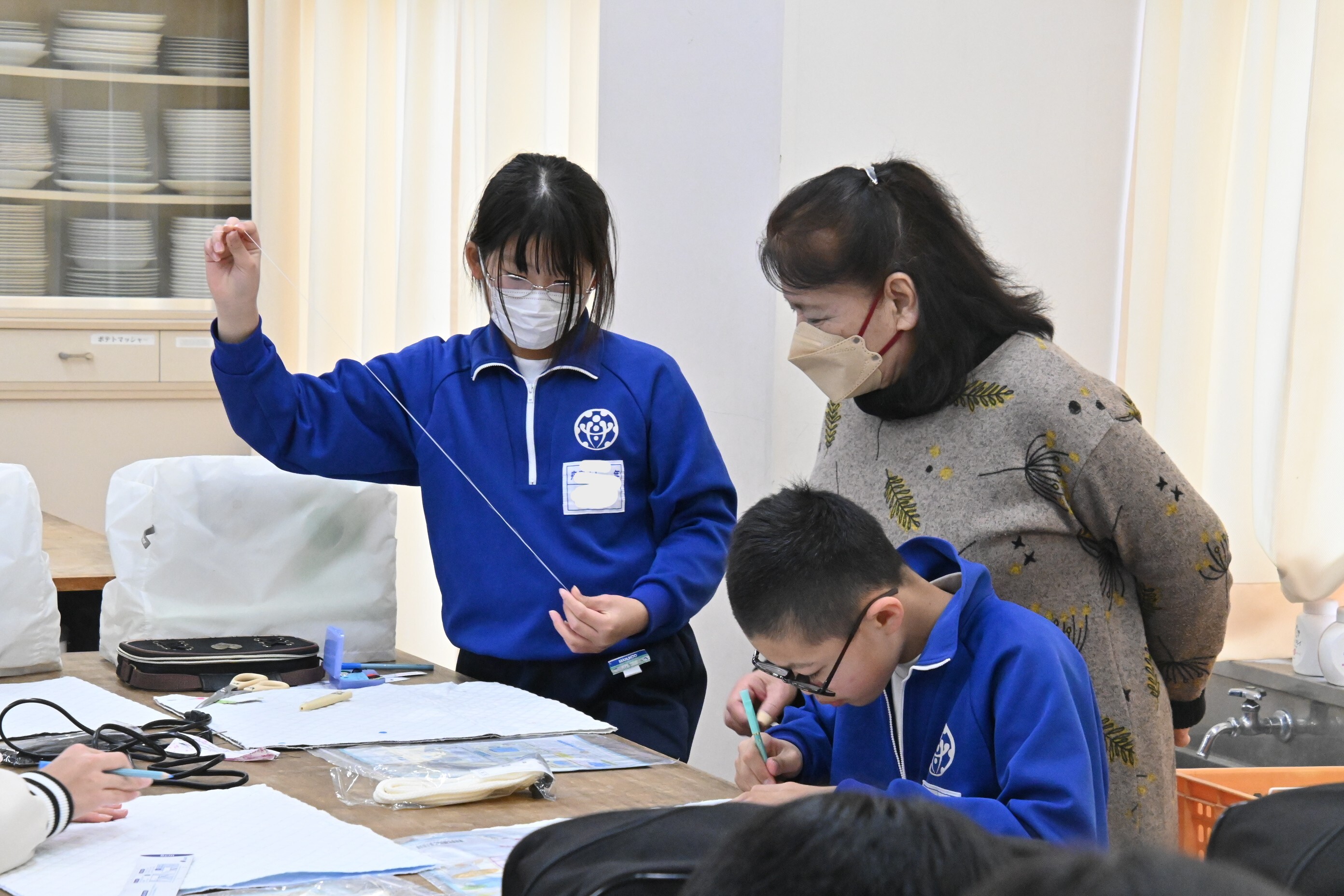5年生の家庭科の授業で「舟島小応援団」の皆様のご協力を得てミシン実習が行われました。