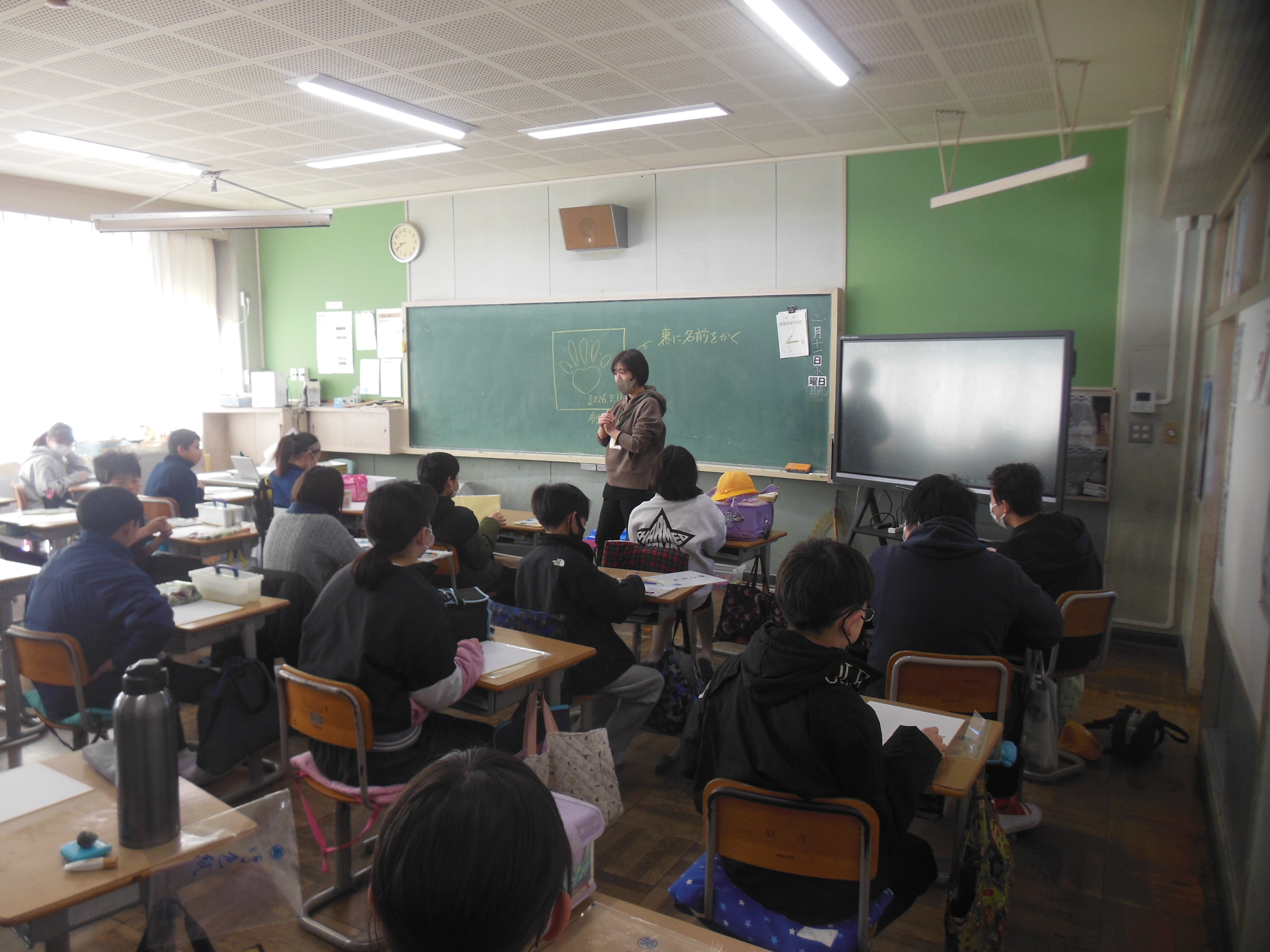 3月11日(水曜日)、卒業式2日前を迎えた6年生は色紙に手形を押しました。先生の話を聞いた後、それぞれ活動に入りました。子どもたちは6年間の成長の姿を実感することができました。