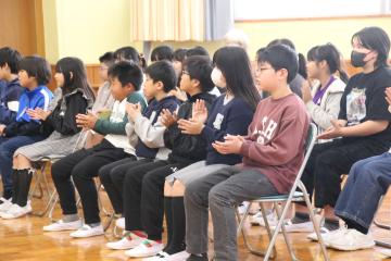 6年生が前に出て、校歌を歌い紹介しました